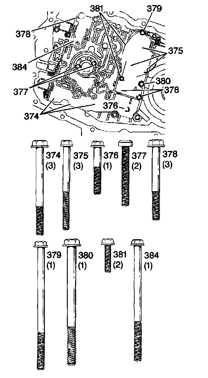 5. Install the valve body bolts (374,381, 384).