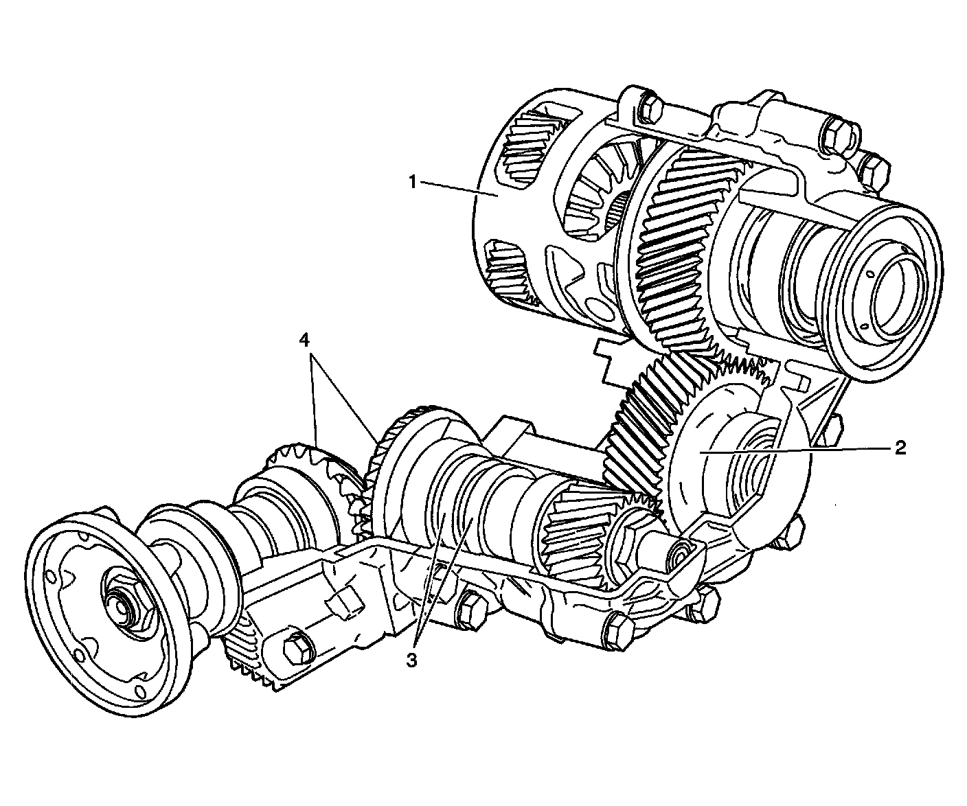 Transfer Case Description and OperationThe transfer case assembly consists of a four-piece aluminum housing, an input helical gear assembly or carrier (1), an idler helical gear (2), and a hypoid bevel gear set which consists of two shaft assemblies supported by tapered roller bearings (4). The design of this component changes power output from transverse to longitudinal and also positions the propeller shaft assembly near the centerline of the vehicle. The propeller shaft assembly, mated to the output flange of the transfer case, is constantly rotating and spins at a rate equal to an average of the two front wheels.