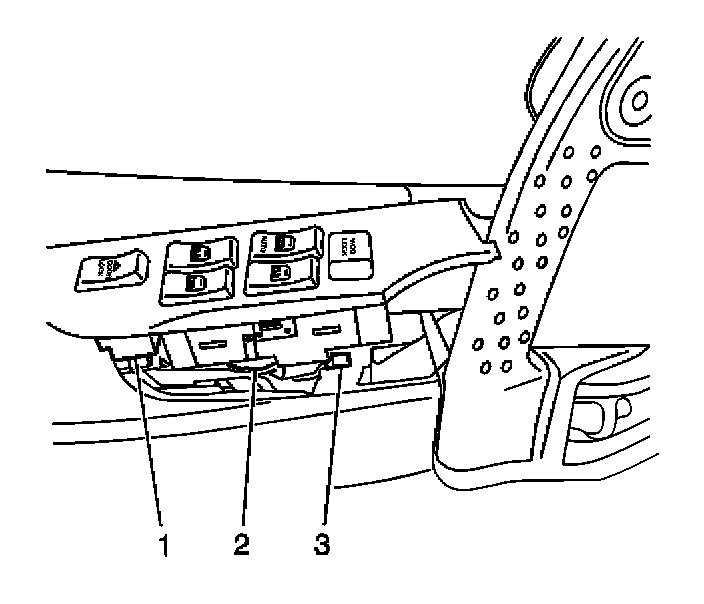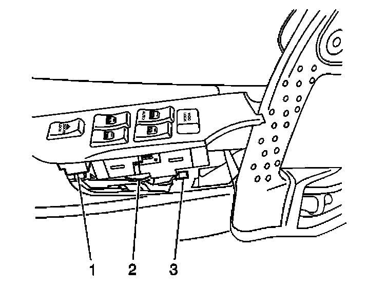 1. Install the front door window control switch (2) into the front door window switch plate.