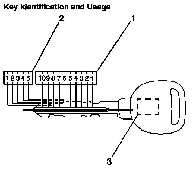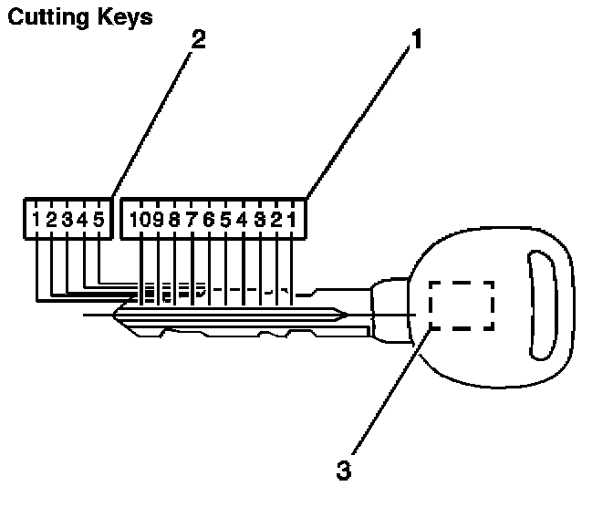 The key code can be obtained from the five-digit number on the key tag that accompanies the original master and valet keys. The five-digit key code cross references to the cut and tumbler sequence. The keys have 10 key cut positions (1) and five key cut depths (2). Key cut positions are numbered 1-10, counting from the head of the key to the tip. The key cut depths are 1-5, cut depth number 1 is the deepest cut. The key transponder (3) in the master and valet key must be programmed to the vehicle. Refer to Programming Theft Deterrent System Components in Theft Deterrent.