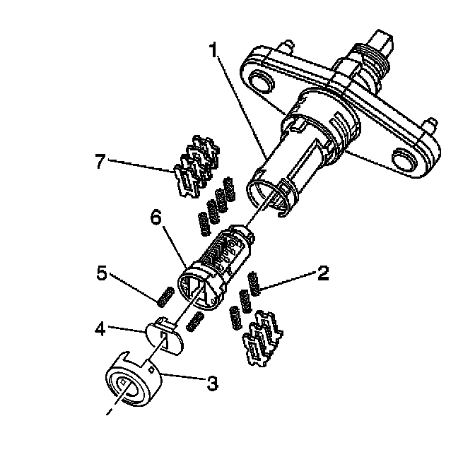3. Install the tumbler (1) for key cut position 7 into the slot nearest to the front of the lock cylinder.