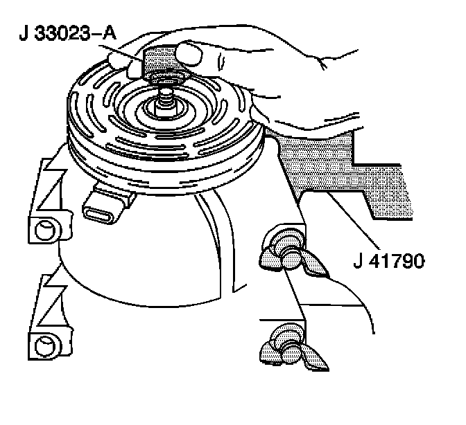 6. Hold the compressor pulley puller in place and use a wrench to turn the center forcing screw against the puller pilot to remove the clutch rotor and bearing assembly.