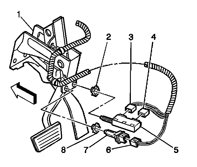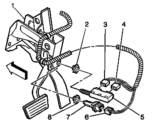 2. Disconnect the electrical connectors (3, 4) from the stop lamp switch (5).