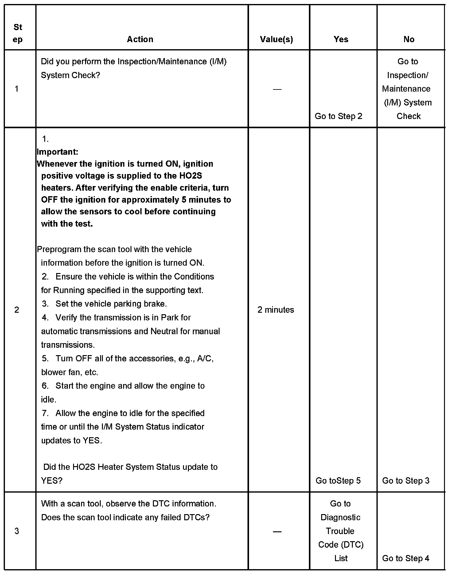 The purpose of this test is to satisfy the enable criteria necessary to execute I/M readiness diagnostics for the heated oxygen sensor (HO2S) system. The test may be used to set the I/M System Status to YES. Ensure the vehicle meets the requirements listed in Conditions for Running before performing this test. Failure to meet the necessary requirements may produce inaccurate test results.