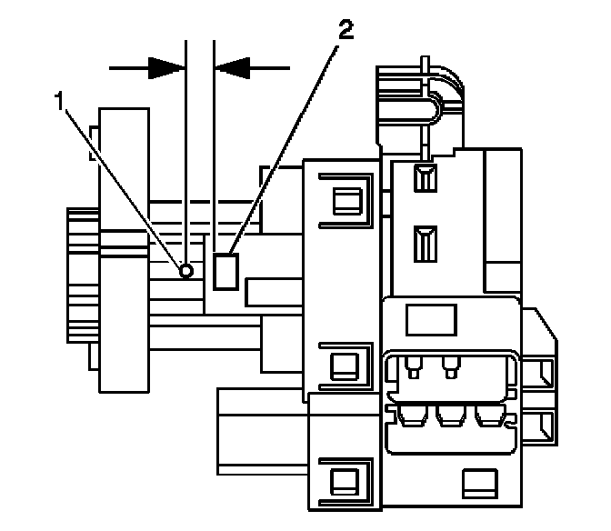 12.2. Locate the surface for the ignition lock cylinder release button (2) on the plastic ignition switch housing and center punch a location (1) on the rib 9.5 mm (3/8 in) rearward, toward the key entry end, from the cylinder release button.