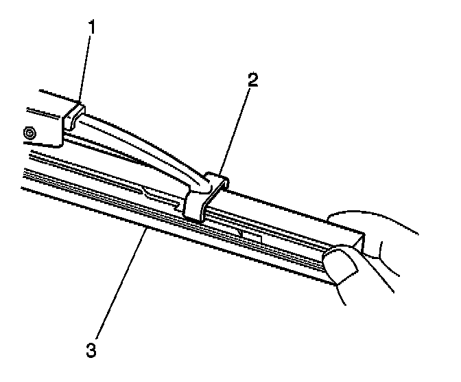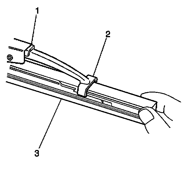 3. Engage the bottom claw (2) of the wiper blade (1) into the notches in wiper blade element (3).