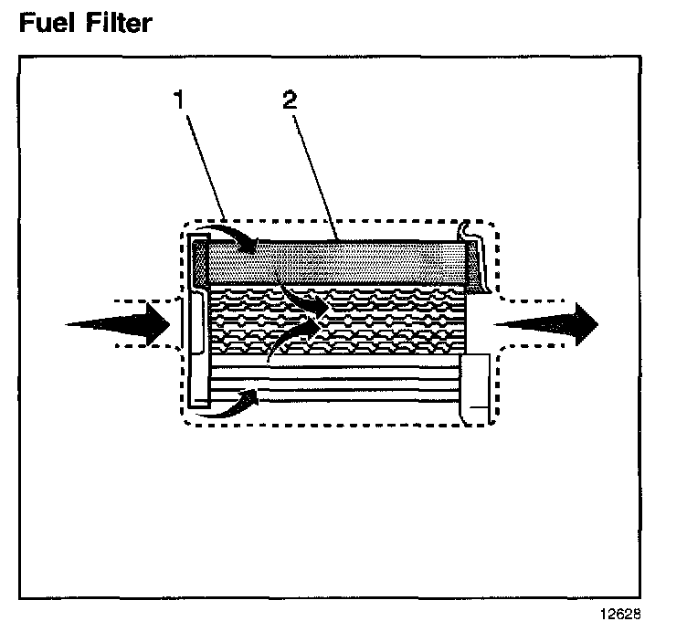 The fuel filter is located on the fuel feed pipe, between the fuel pump and the fuel injectors. The paper filter element (2) traps particles in the fuel that may damage the fuel injection system. The filter housing (1) is made to withstand maximum fuel system pressure, exposure to fuel additives, and changes in temperature. There is no service interval for fuel filter replacement. Replace a restricted fuel filter.
