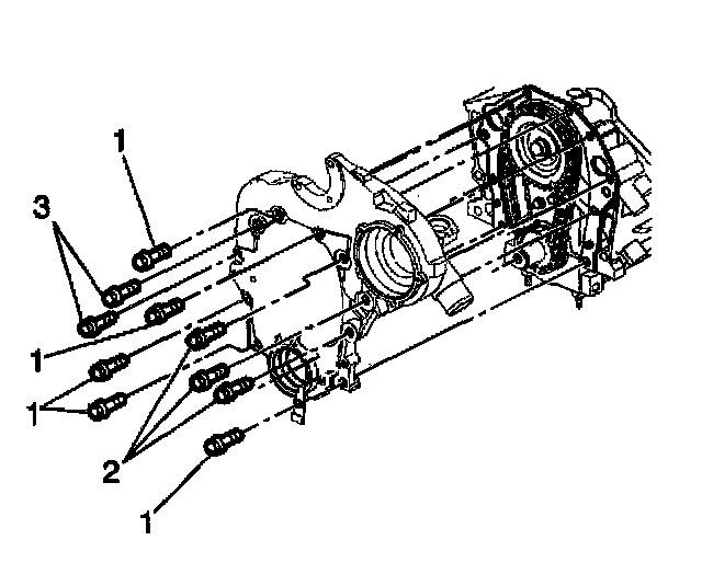 - Tighten the small engine front cover bolts (1) to 27 Nm (20 ft. lbs.).
