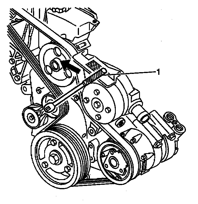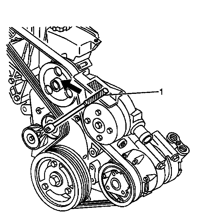 1. Remove the drive belt tensioner by lifting or rotating the drive belt tensioner off of the drive belt, using a 3/8 inch breaker bar (1).