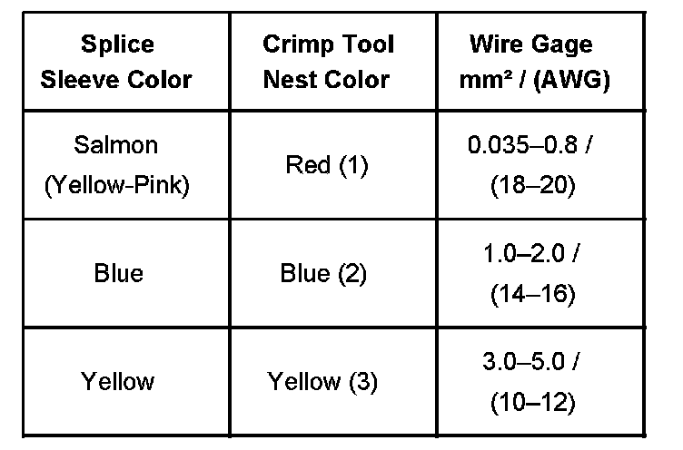 4. Select the proper sealed splice sleeve according to the wire size. Refer to the table at the beginning of the repair procedure for the color coding of the splice sleeves and the crimp tool nests.