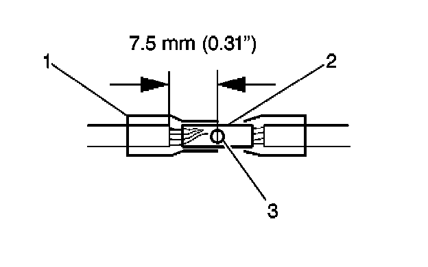 6. Place the splice sleeve in the nest. Ensure that the crimp falls midway between the end of the barrel and the stop. The sleeve has a stop (3) in the middle of the barrel (2) in order to prevent the wire (1) from going further. Close the hand crimper handles slightly in order to firmly hold the splice sleeve in the proper nest.