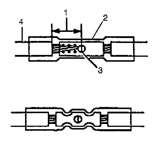 - Strip approximately 7.5 mm (5/16 in) of insulation from each wire to be spliced (1).