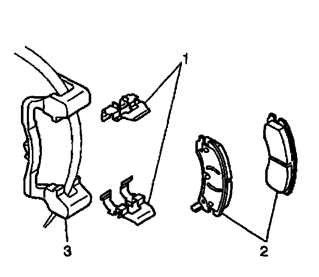 6. Install the brake pad retainers (1) to the bracket caliper bracket (3).