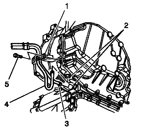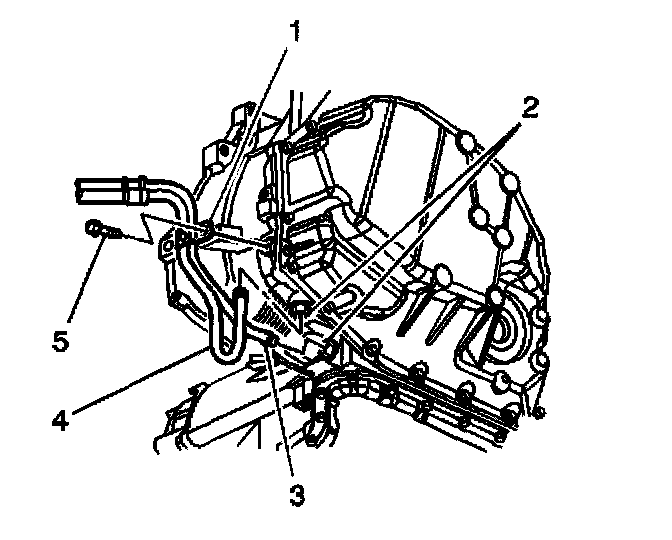 8. Remove the retaining bracket bolt (5) from the transaxle oil cooler hose/pipe retaining bracket (1).