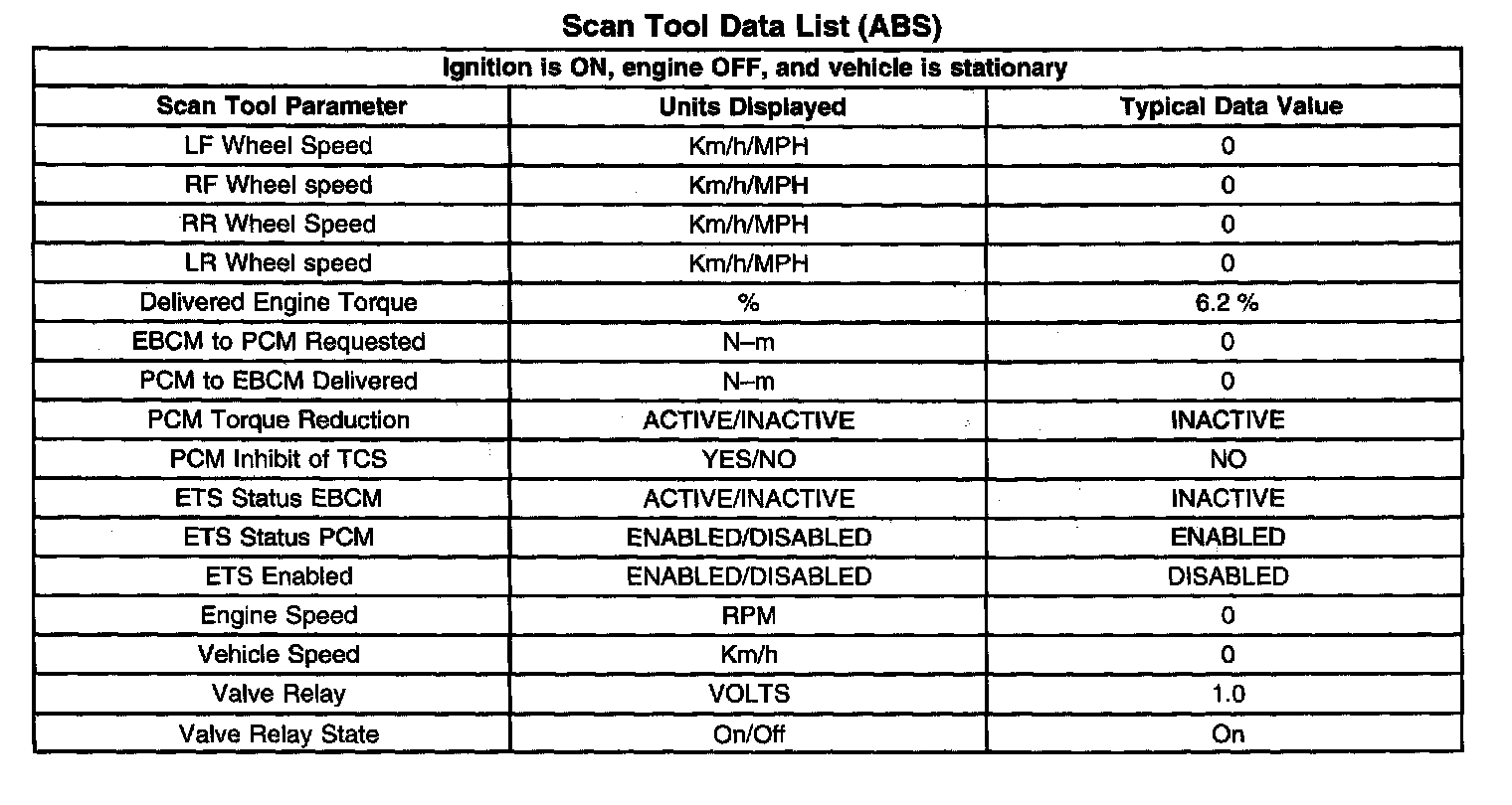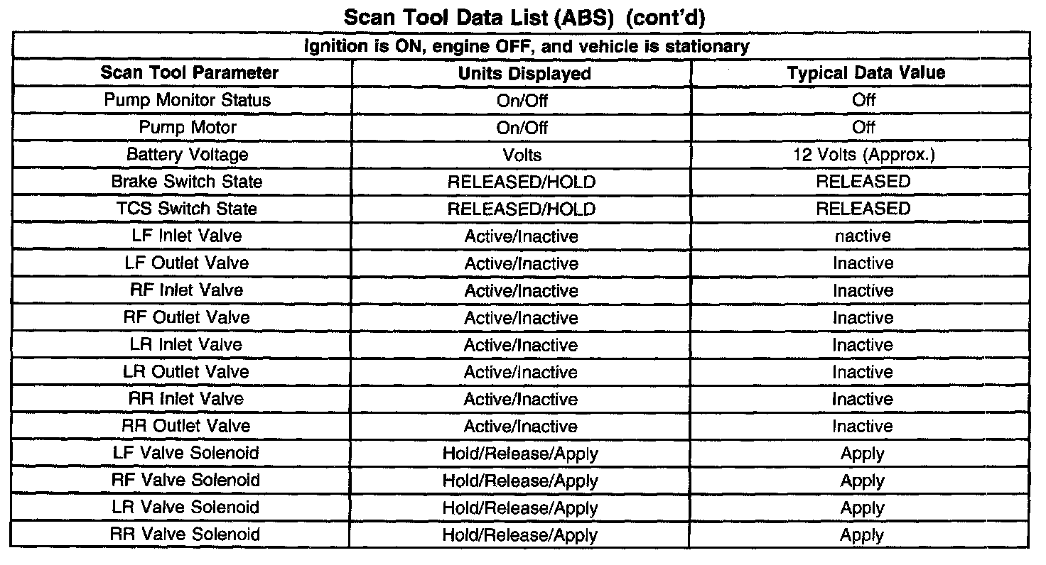 The Scan Tool Data List contains all of the antilock brake system related parameters under the Data Display Function that are available on the scan tool. The parameters in the list are arranged in alphabetical order.