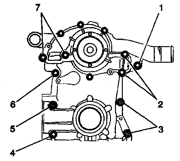 12. Install the engine front cover bolts (1-7).