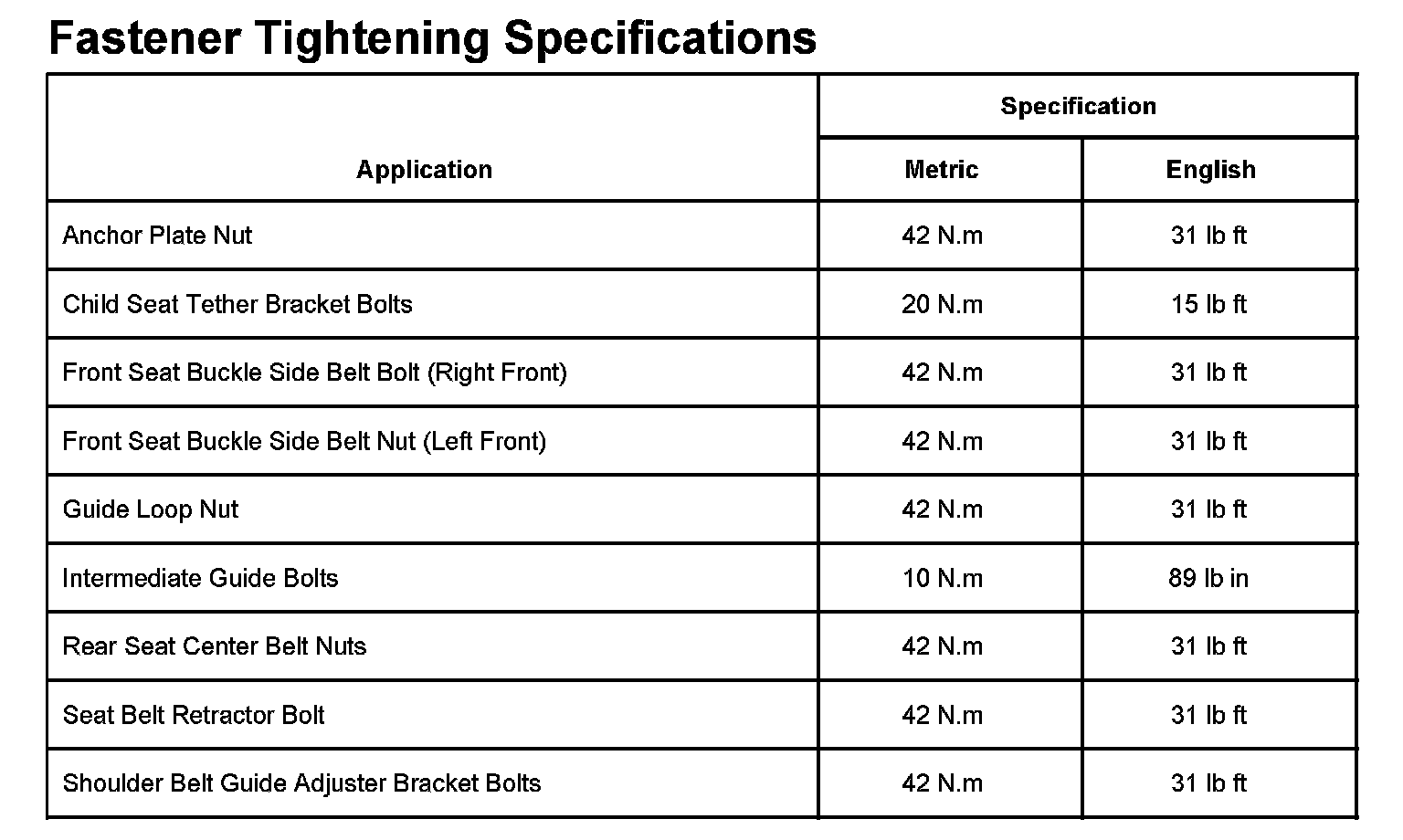 Fastener Tightening Specifications: