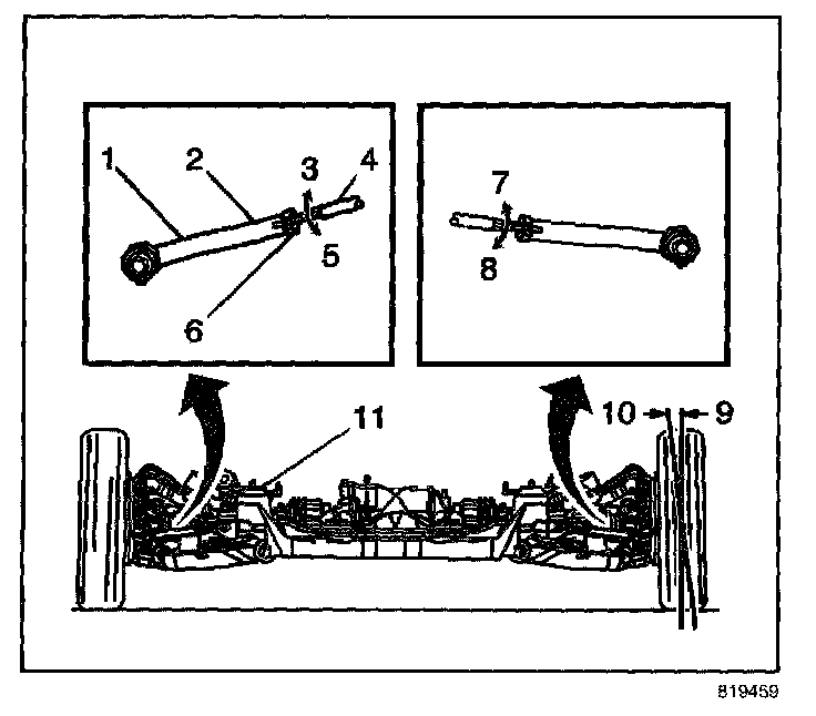 1. Loosen the jam nut (6) at the rear wheel tie rod.