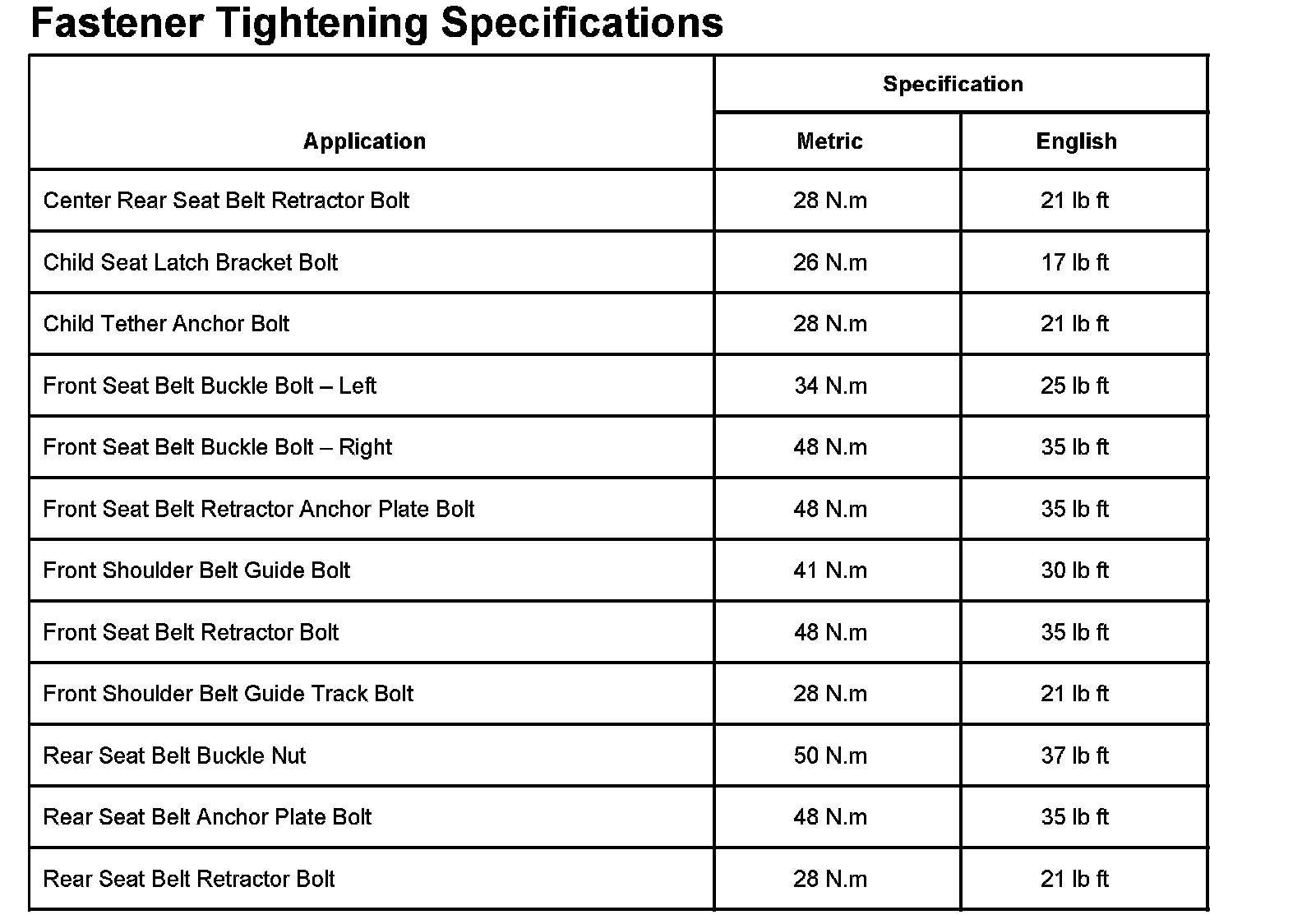 Fastener Tightening Specifications: