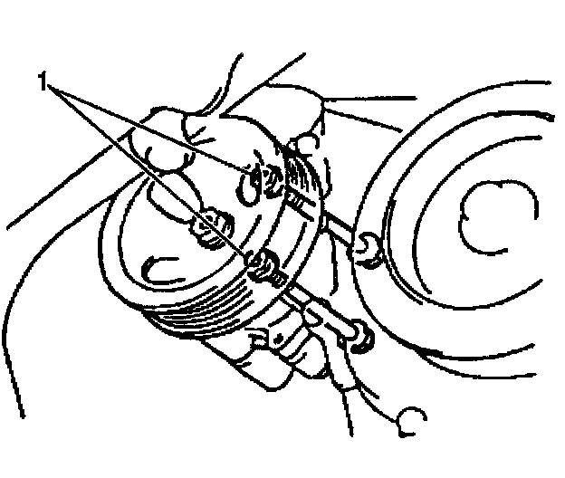 15. Remove the two power steering pump through bolts and the nuts (1).