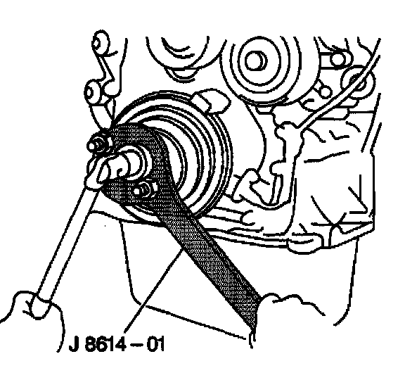 18. Remove the crankshaft pulley retaining bolt using J 8614-01.