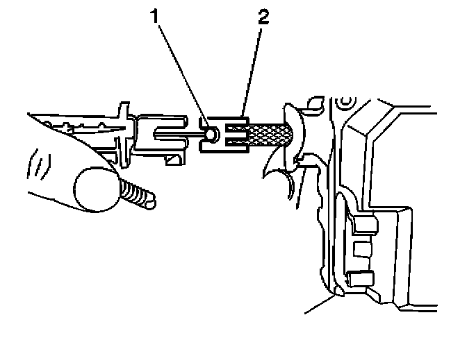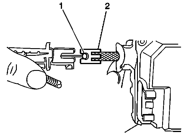 1. Install the cruise control cable ball stud (1) into the slot in the cruise control module actuator strip (2).