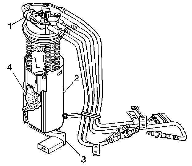 The fuel tank stores the fuel supply. An electric fuel pump, located in the fuel tank with the fuel sender assembly, pumps fuel through an in-line fuel filter to the fuel rail assembly. The pump provides fuel at a pressure more than is needed by the injectors. The fuel pressure regulator, part of the fuel rail assembly, keeps fuel available to the injectors at a regulated pressure. A separate pipe returns unused fuel to the fuel tank.