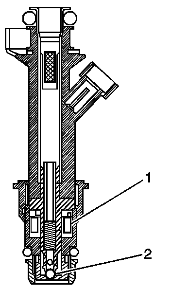 The fuel injector assembly is a solenoid operated device, controlled by the PCM, that meters pressurized fuel to a single engine cylinder. The PCM energizes the high-impedance (12.0 ohms) injector solenoid (2) to open a normally closed ball valve (3). This allows fuel to flow into the top of the injector, past the ball valve, and through a director plate at the injector outlet. The director plate has four machined holes that control the fuel flow, generating a spray of finely atomized fuel at the injector tip. Fuel from the injector tip is directed at the intake valve, causing the fuel to become further atomized and vaporized before entering the combustion chamber. An injector stuck partly open can cause a loss of pressure after engine shutdown. Consequently, long cranking times would be noticed on some engines.
