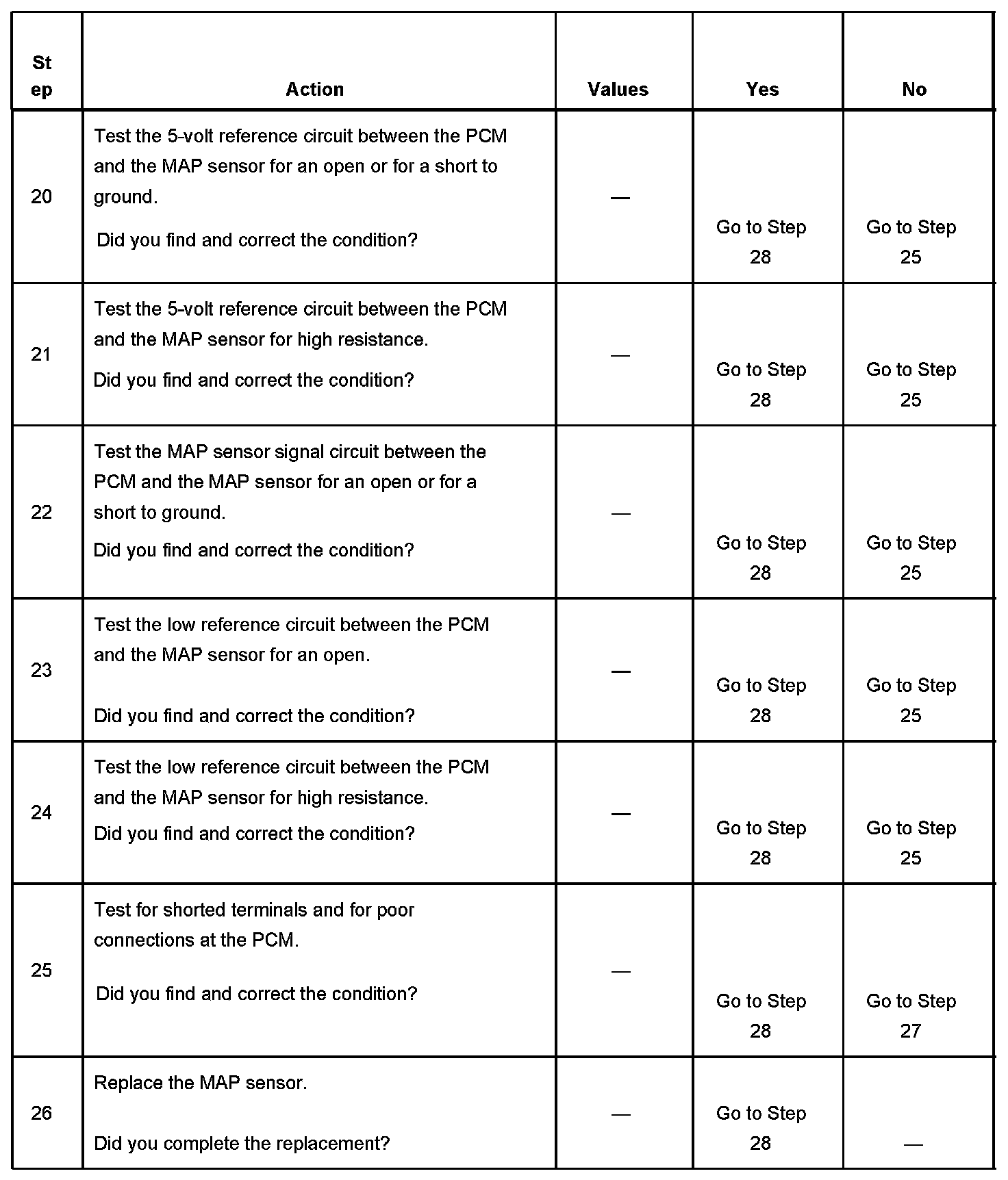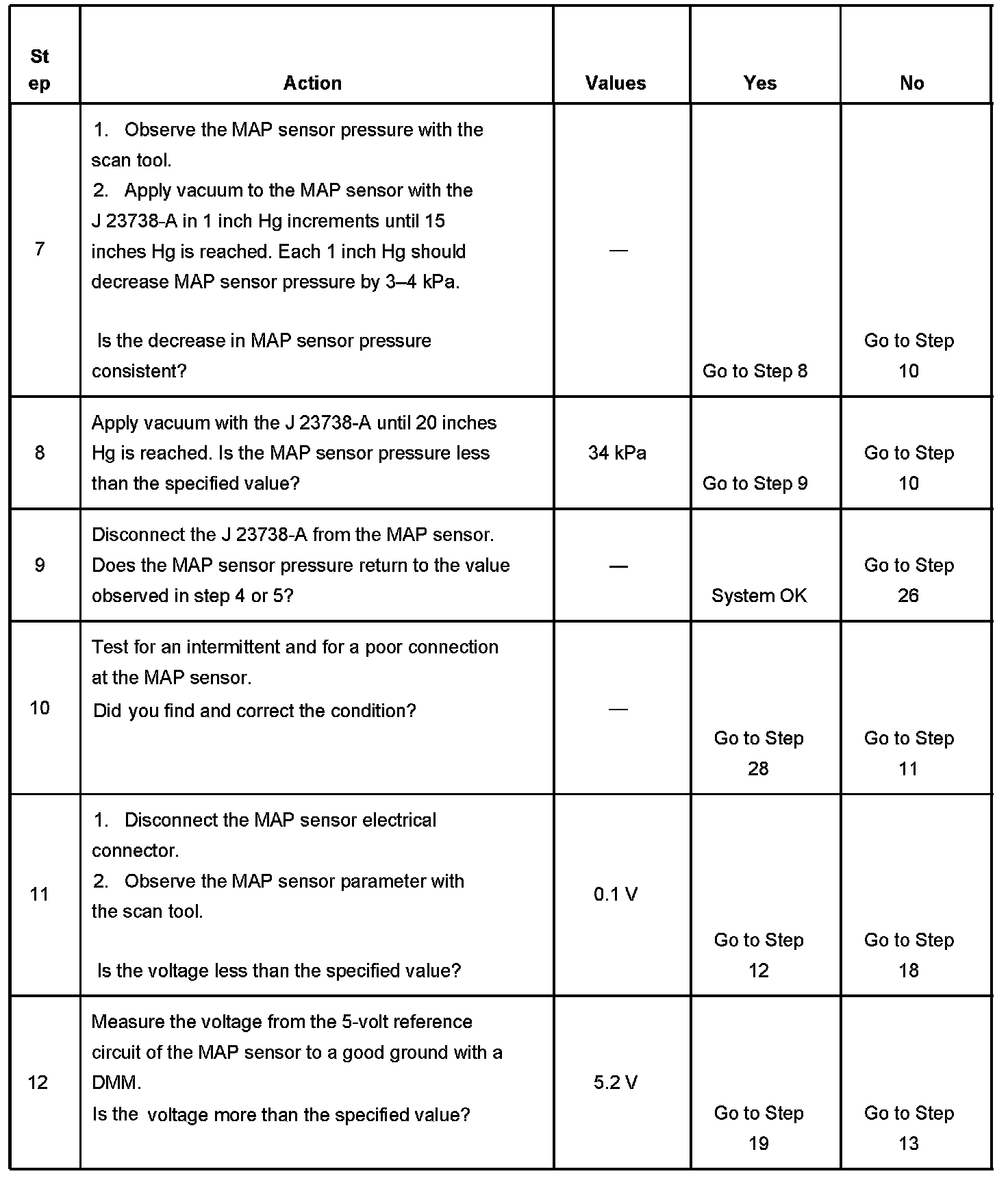 The manifold absolute pressure (MAP) sensor responds to changes in intake manifold pressure which gives an indication of the engine load. The MAP sensor has a 5-volt reference circuit, a low reference circuit, and a signal circuit. The powertrain control module (PCM) supplies 5 volts to the MAP sensor on the 5-volt reference circuit and provides a ground on the low reference circuit. The MAP sensor provides a signal to the PCM on the MAP sensor signal circuit, which is relative to the pressure changes in the manifold. With low MAP, such as during idle or deceleration, the PCM should detect a low MAP sensor signal voltage. With high MAP, such as ignition ON, engine OFF or wide open throttle (WOT), the PCM should detect a high MAP sensor signal voltage. The MAP sensor is also used in order to calculate the barometric pressure (BARO) when the ignition switch is turned ON, with the engine OFF. The BARO reading may also be updated whenever the engine is operated at WOT. The PCM monitors the MAP sensor signal for voltage outside of the normal range. If the PCM detects a MAP sensor signal voltage that is excessively low, DTC P0107 sets. If the PCM detects a MAP sensor signal voltage that is excessively high DTC P0108 sets.