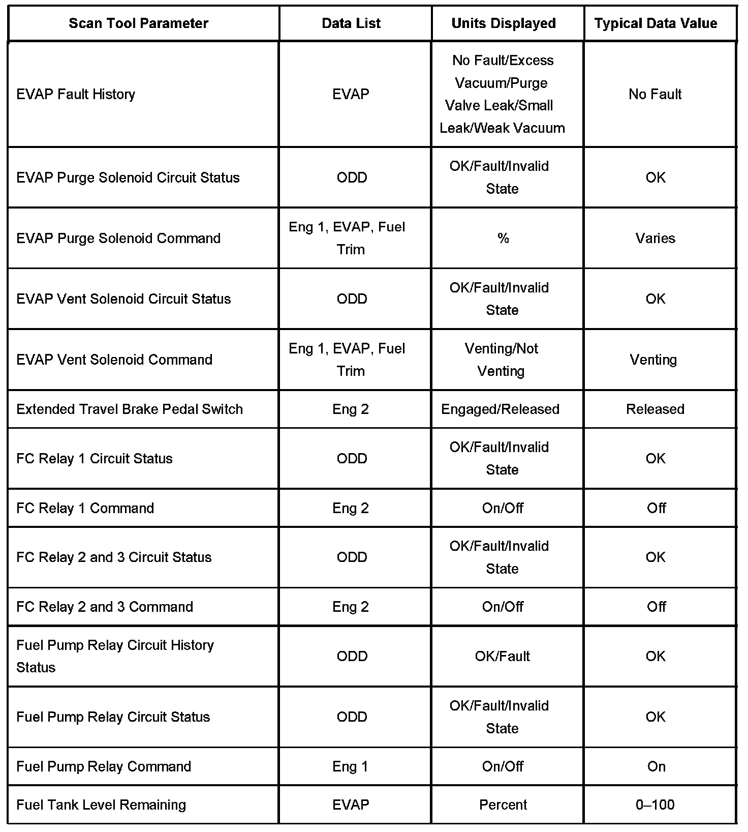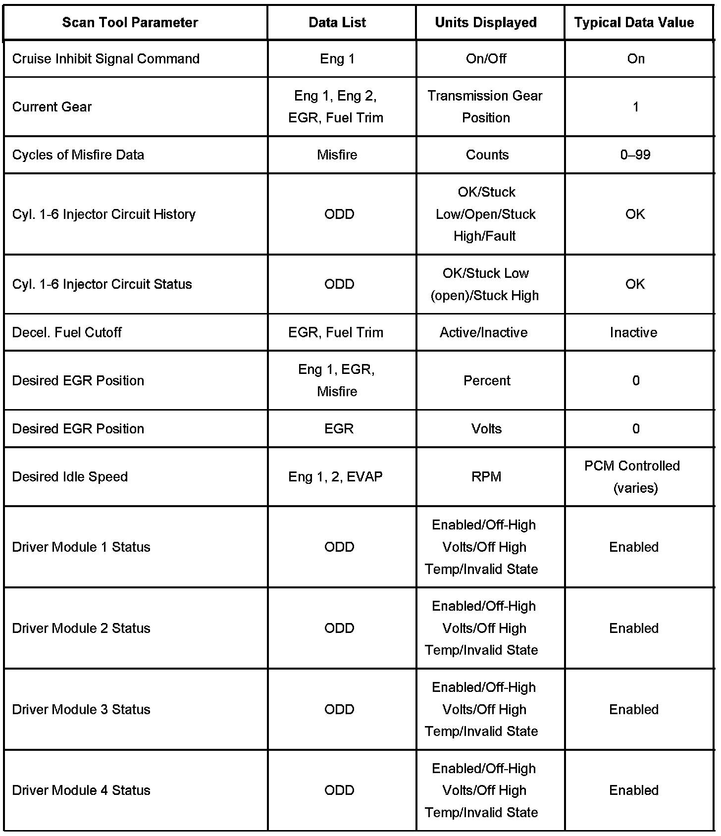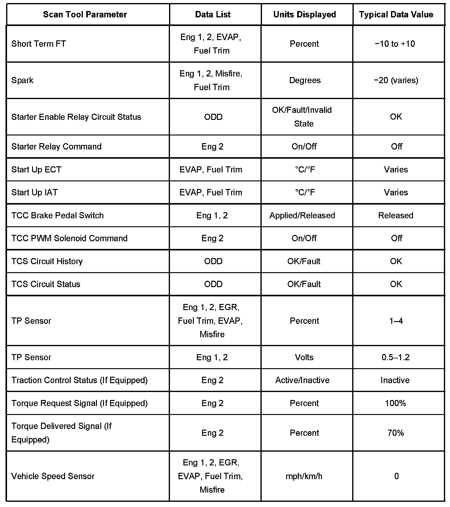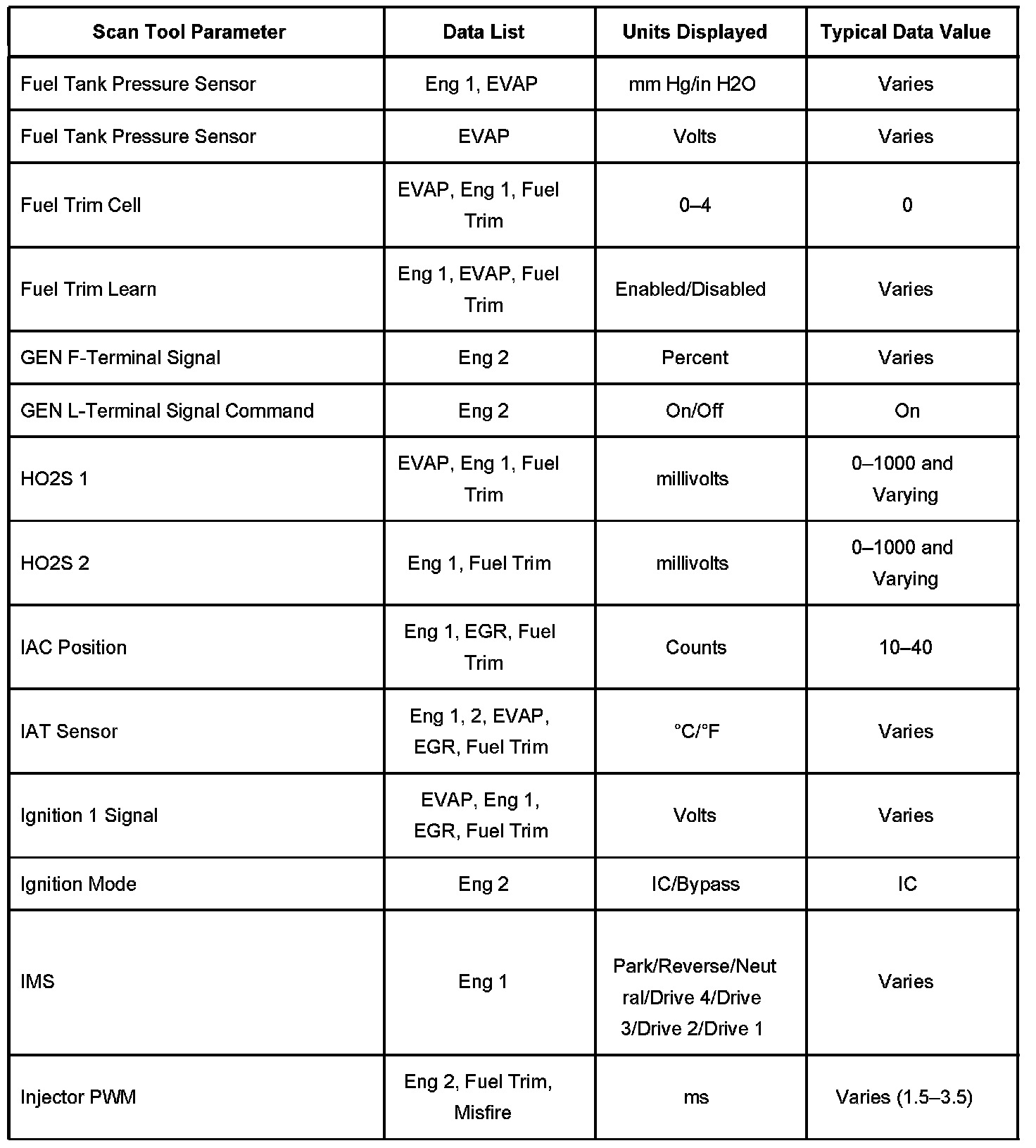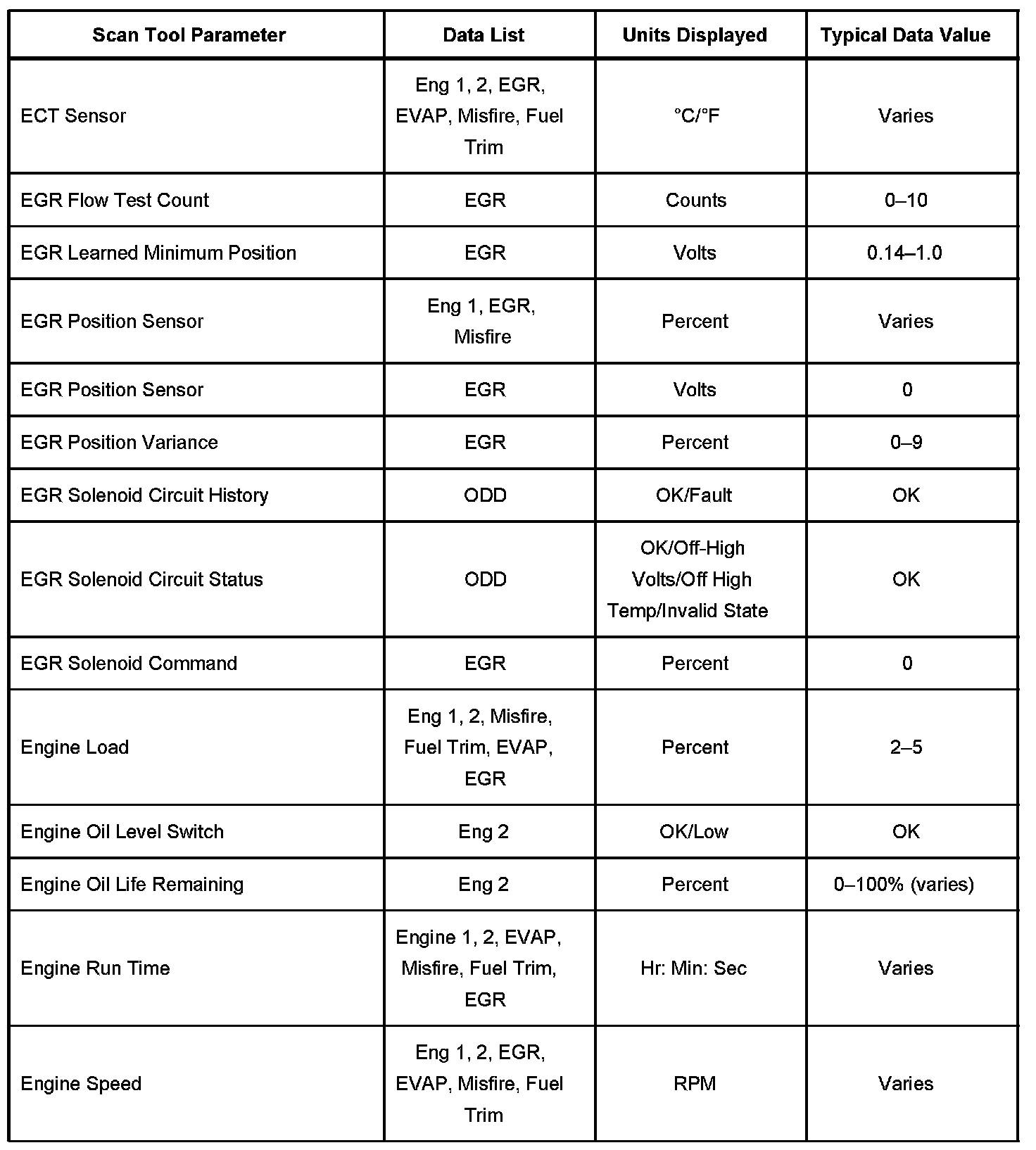 The Engine Scan Tool Data List contains all engine related parameters that are available on the scan tool. The list is arranged in alphabetical order. A given parameter may appear in any one of the data lists, and in some cases may appear more than once, or in more than one data list in order to group certain related parameters together.