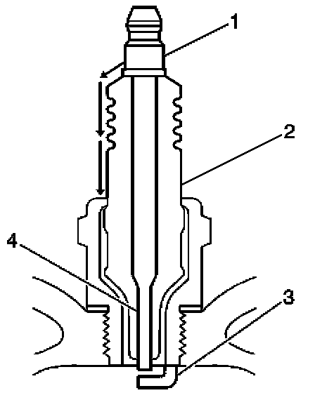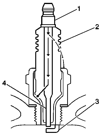 - Inspect the insulator (2) for cracks. All or part of the electrical charge may arc through the crack instead of the electrodes (3, 4).