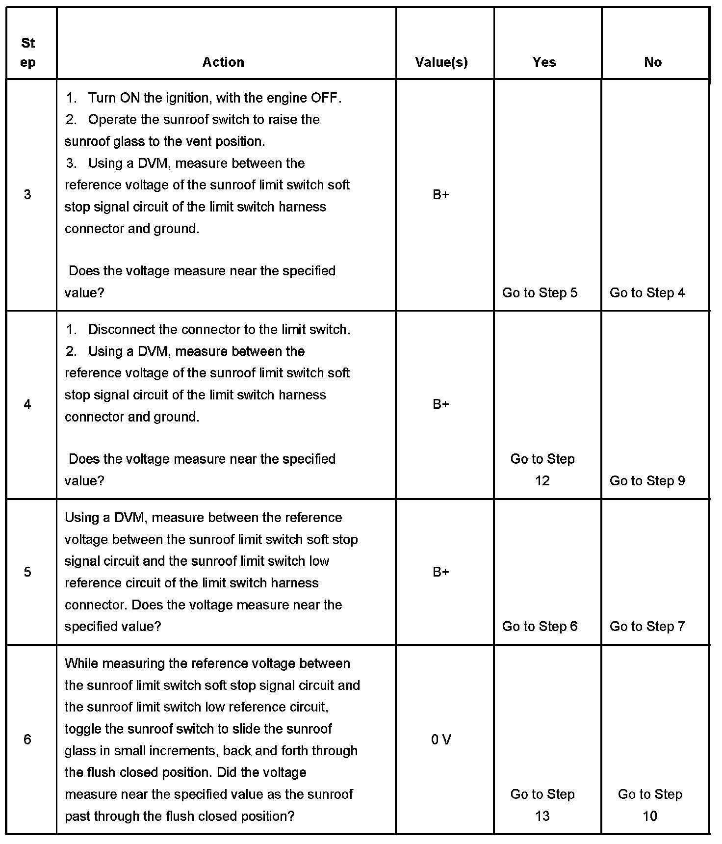 2. If the system does close properly, then suspect either the sunroof limit switch soft stop signal circuit or the sunroof limit switch low reference circuit for a poor connection or intermittent.