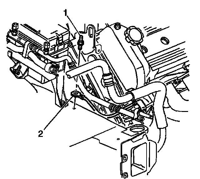16. Install the nut (2) securing the power steering pressure hose to the right engine mount bracket (1).