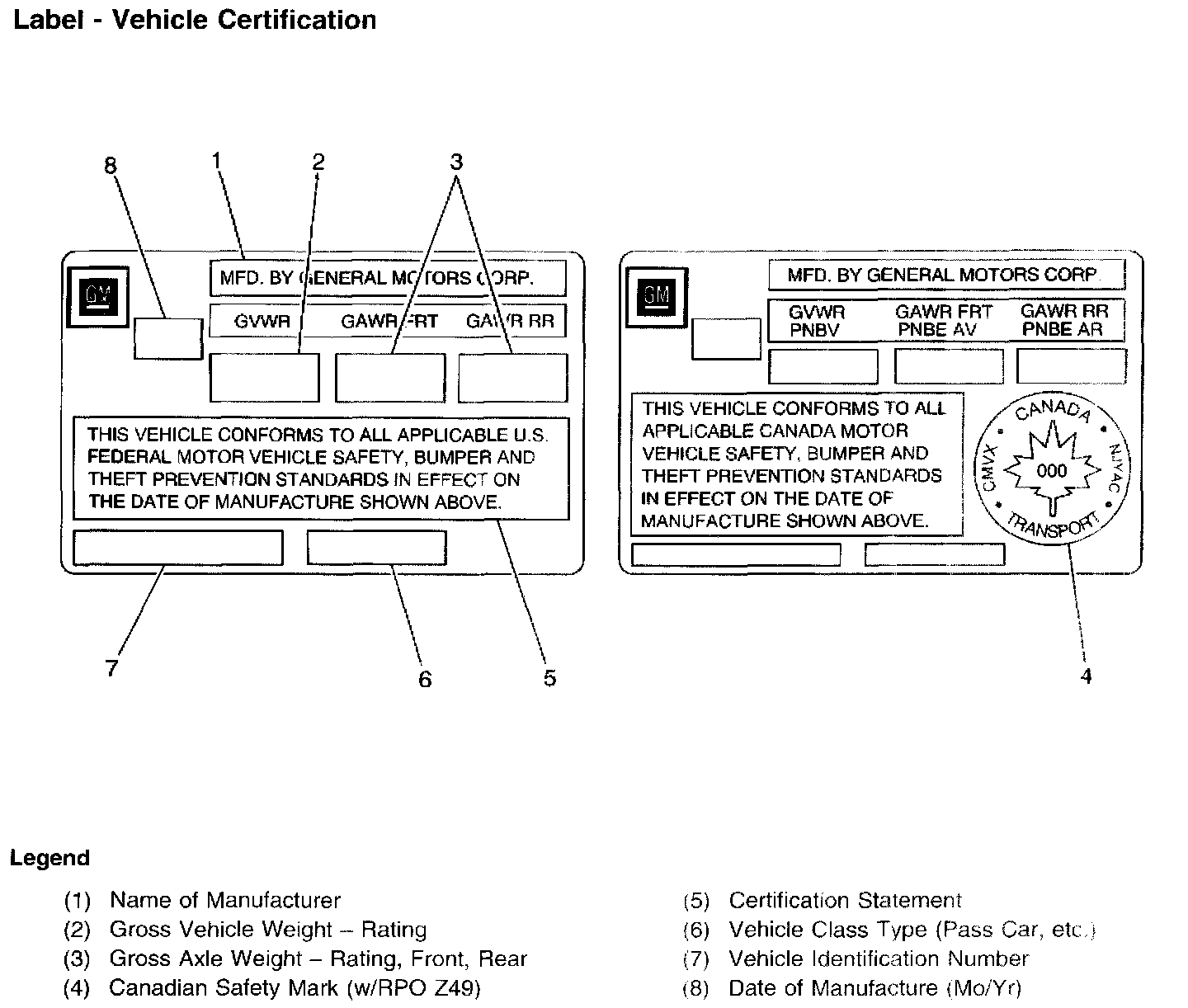 The vehicle certification label is permanently located on the edge of the driver's door. Refer to this label in order to obtain the following information:
