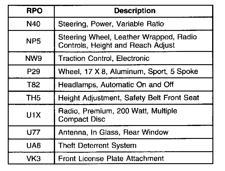 The production and process codes provide the description of the Regular Production Options (RPOs) used on the GTO. The RPO list is printed on the Service Parts Identification Label. The following is a list of the RPO abbreviations and the description of each: