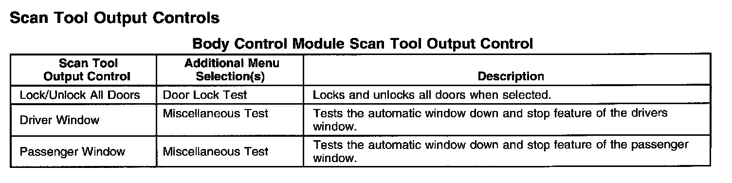 Body Control Module Scan Tool Output Control: