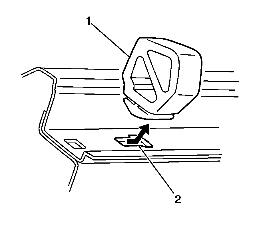7. Tilt the hood side bumper (1) forward slightly and carefully slide it rearward to disengage it from the inner edge of the fender (2).