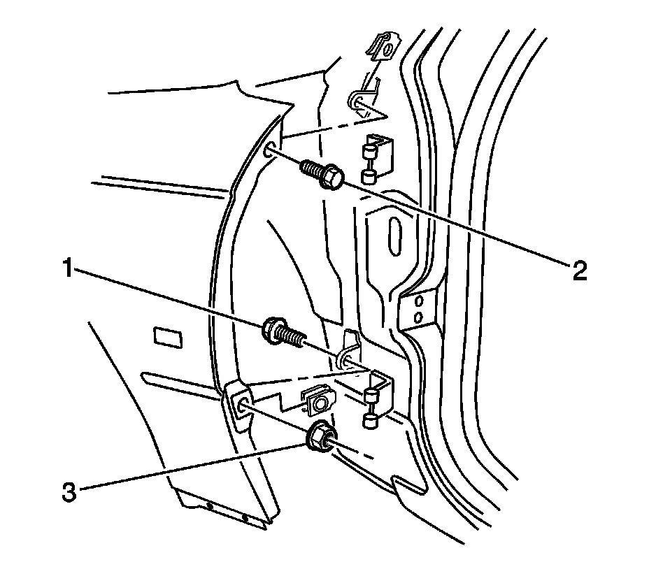 12. Remove the rocker panel molding bracket (2) from the lower rear edge of the fender (3), if necessary.