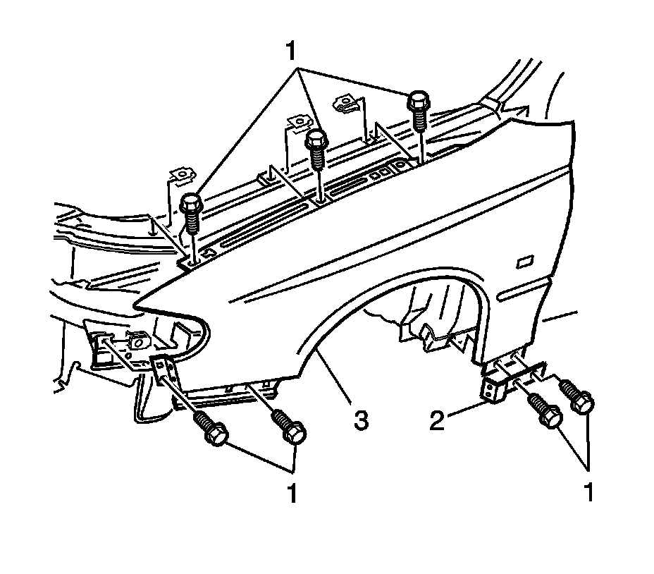 11. Remove the 7 bolts (1) attaching the fender (3) to the vehicle.