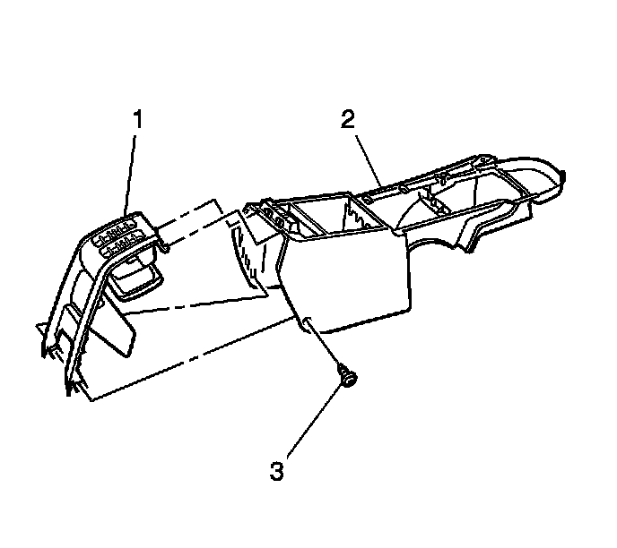 1. Remove the screws (3) from each side of the floor console (2) attaching the center console end panel (1) to the floor console (2).