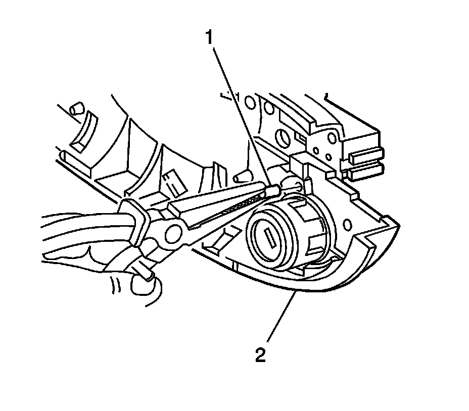 2. Install the door lock barrel housing pin (1) to the drivers door outside handle bracket (2).