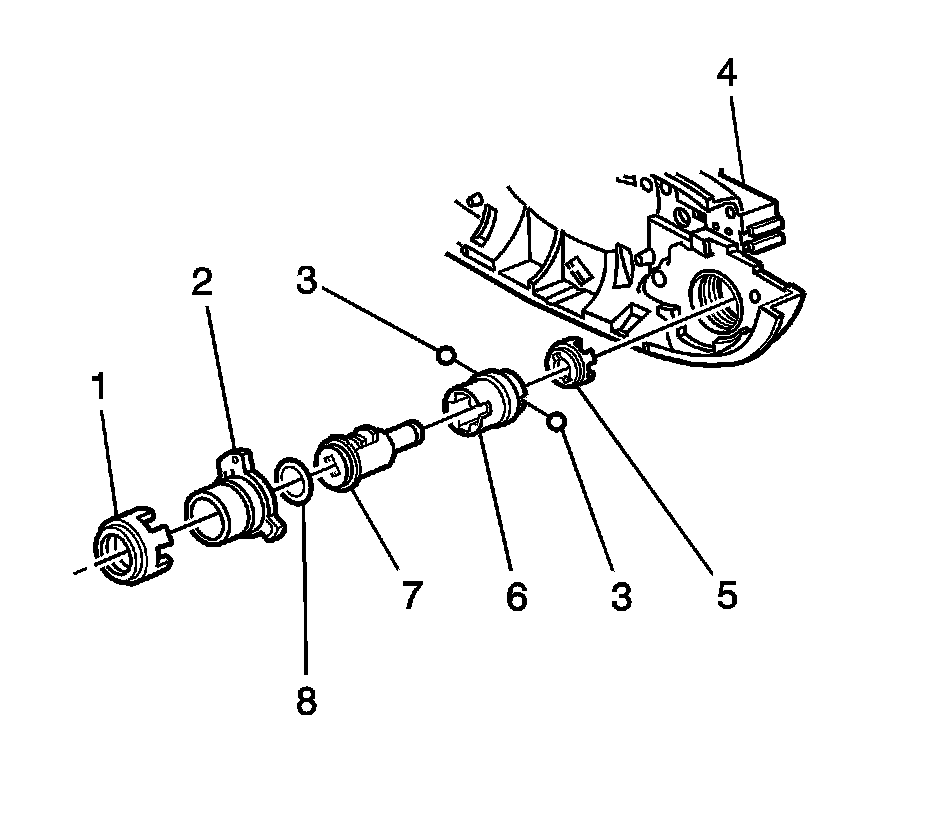 1. Install the coupling (5), sleeve (6) with the two balls (3), cylinder assembly (7) O-ring (8), housing (2) and cover (1) to the door outside handle bracket (4) while rotating in a clock-wise direction.