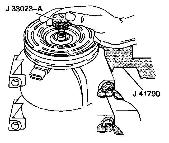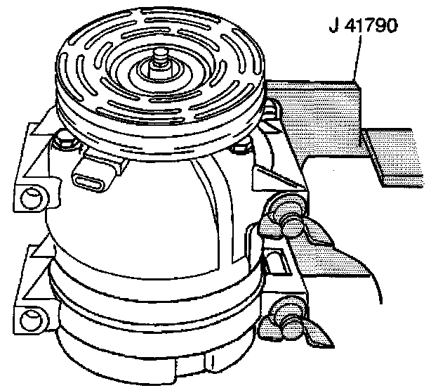 2. Clamp the J 41790 in a vise and attach the A/C compressor to the J 41790.