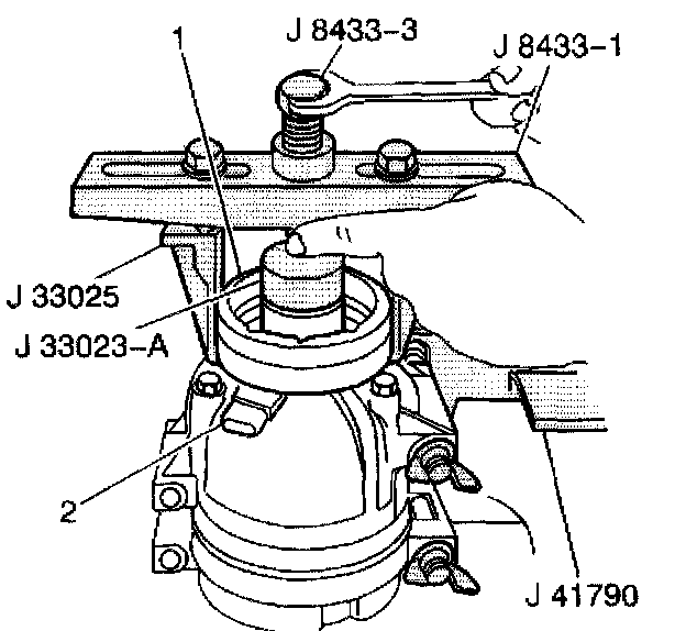 9. Tighten the center forcing screw J 8438-3 of the J 8433 against the J 33023-A to remove the A/C compressor clutch coil from the A/C compressor.