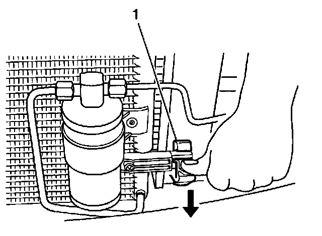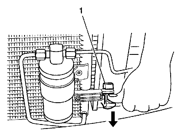 11. Install the retaining clip to the A/C compressor line on the left side of the radiator.