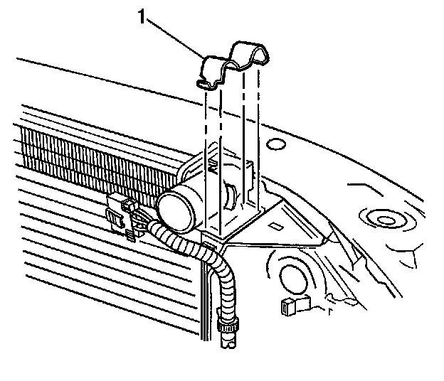 5. Install the two condenser-to-radiator retaining clips as follows: