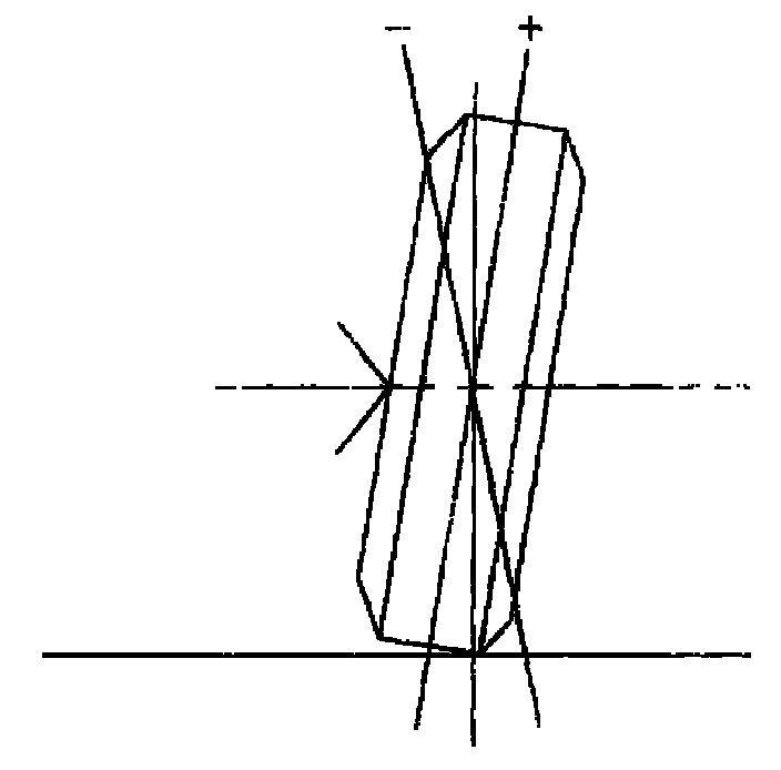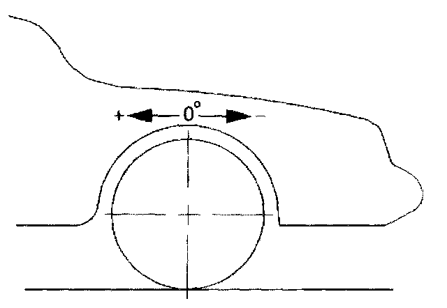 Camber is the tilting of the wheels from the vertical when viewed from the front of the vehicle. When the wheels tilt outward at the top, the camber is positive (+) When the wheel tilts inward at the top the camber is negative (-). The amount of tilt is measured in degrees from the vertical. Camber settings influence the directional control and the tire wear.