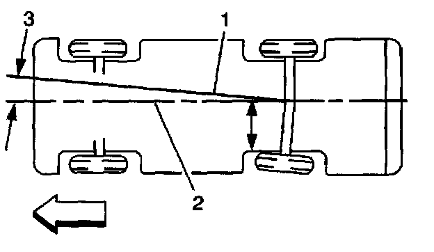 In the illustration, toe-in is shown on the left rear wheel, moving the thrust line (1) off center. The resulting deviation from the centerline is the thrust angle.