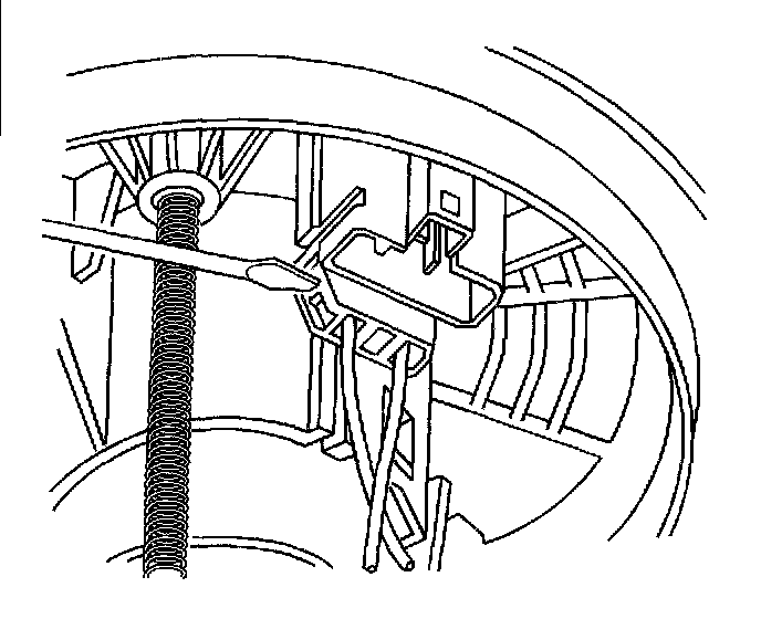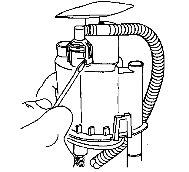 11. Firmly slide the blade between the fuel pump end cap and the internal fuel filter clips that hold the fuel pump in place.