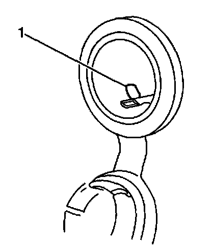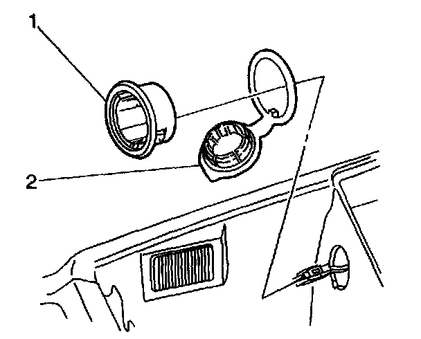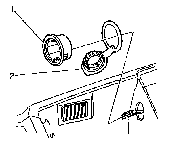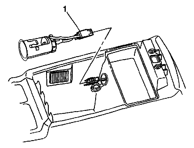 2. Place the T receptacle of J 42059 into one of the retaining tabs (1). Angle the other side into the opposite retaining tab. Pull the power accessory receptacle straight out.